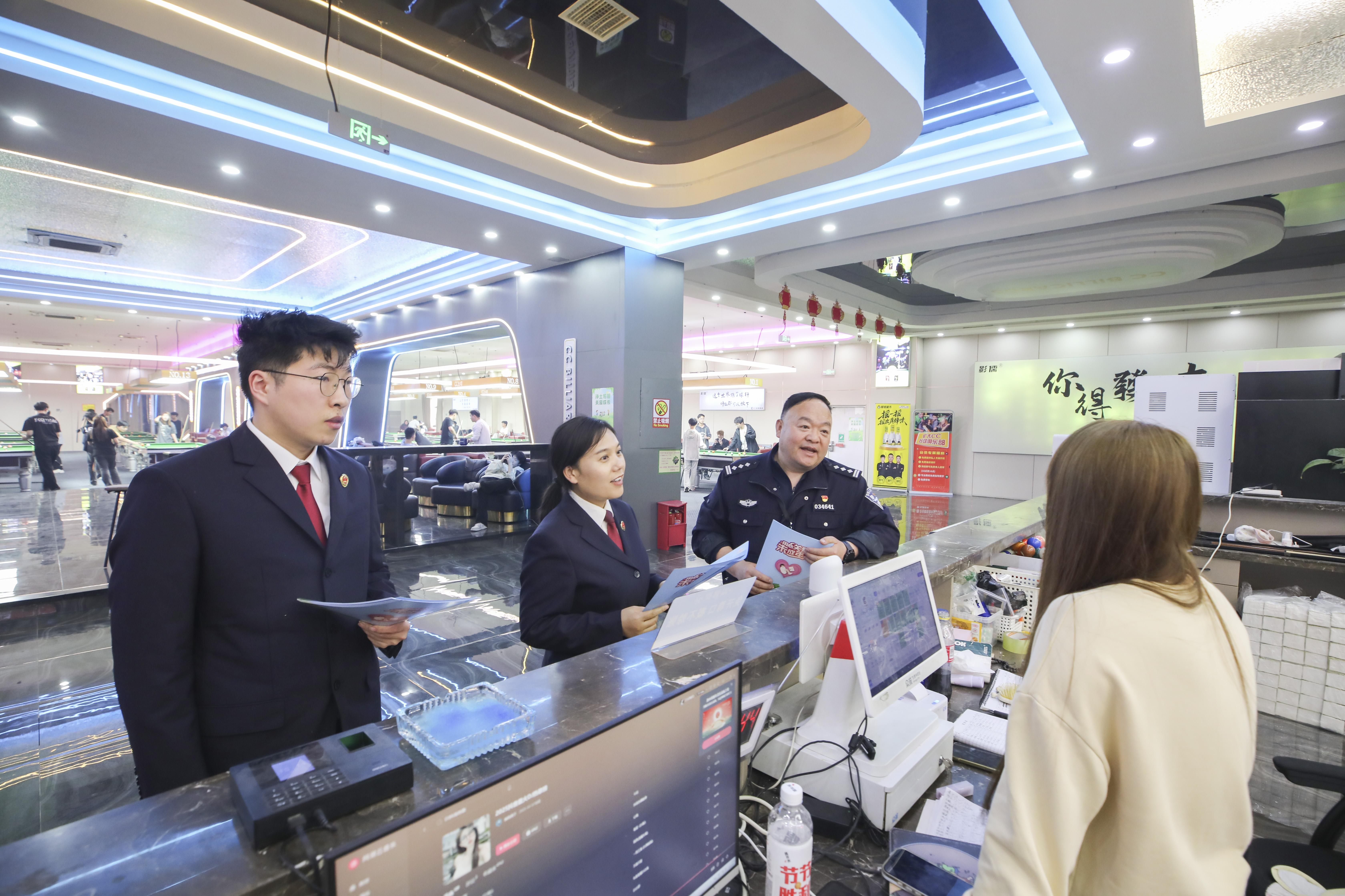 时值江苏省中小学生“春假”期间,江苏省徐州市泉山区人民检察院联合公安机关,深入辖区娱乐场所,向台球室经营者详细讲解强制报告的法律意义与社会意义及报告流程,告知禁止向未成年人销售烟酒,遇到未成年人权益被侵犯或疑似被侵犯,要及时制止并报告,共同筑牢未成年人安全防护网。据了解,活动共发放《未成年人案件强制报告制度责任提示卡》60余份。徐州泉山多部门联合开展主题宣传活动